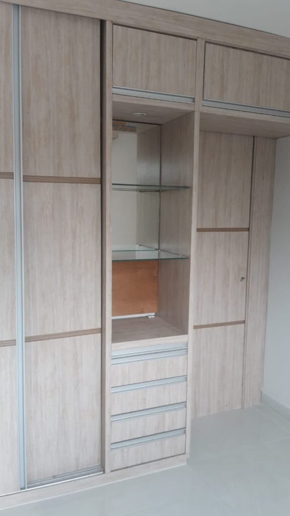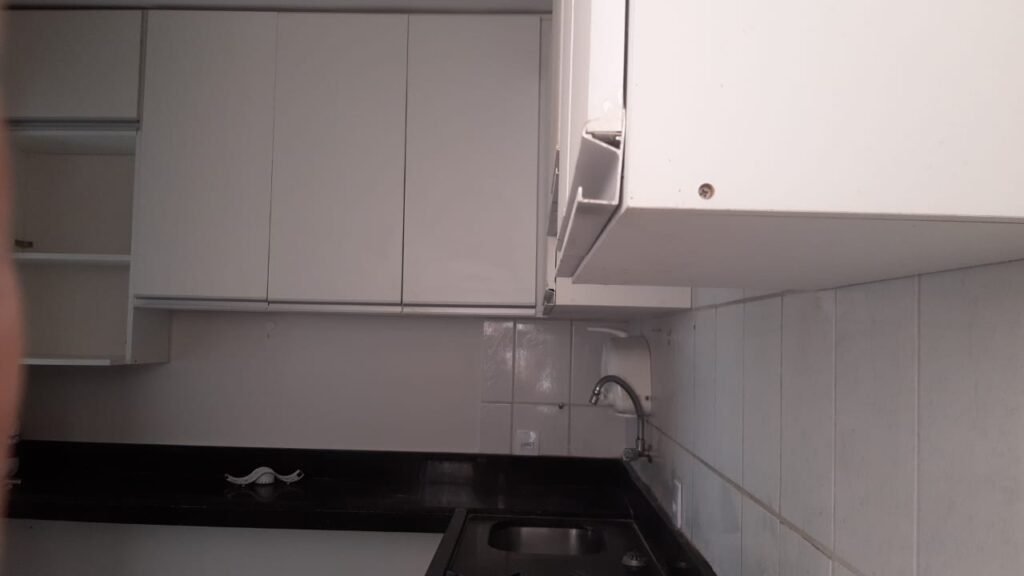 Sala, 2 quartos sendo 1 com armário modulado, banheiro social com armários e box de vidro temperado, cozinha modulada com fogão cooktop e área de serviço. Condomínio com portaria, estacionamento e salão de festas.